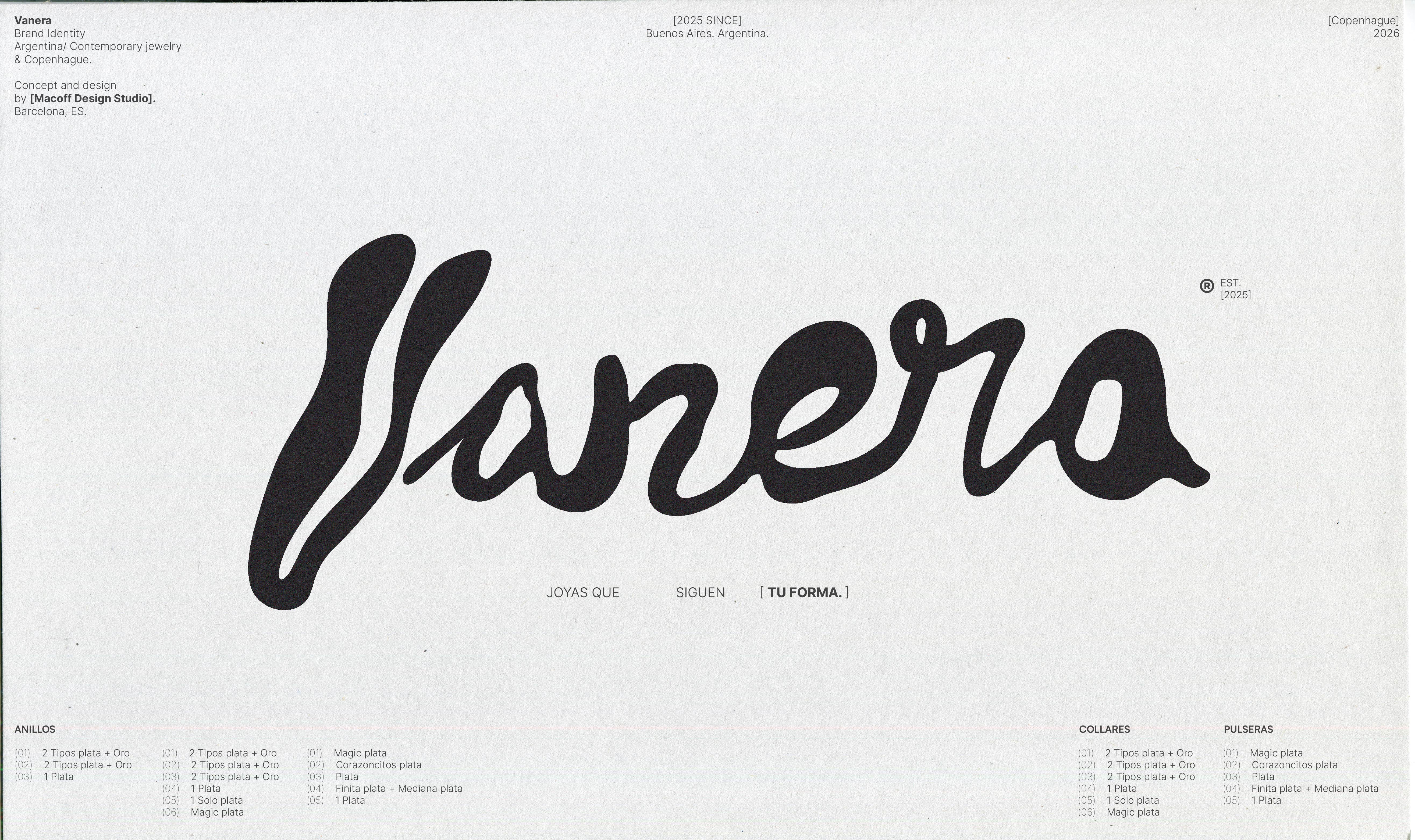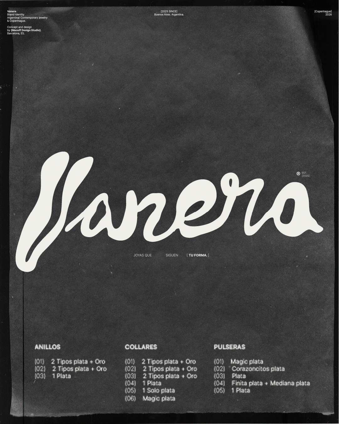 Vanera is a jewelry brand designed to adapt to you, your style, your mood, your way of wearing it. We developed a brand concept and visual identity that feels flexible, refined, and expressive, from naming and creative direction to visual language and applications. Vanera pieces are not fixed; they evolve with you, allowing each person to shape them in their own way and make them part of their everyday identity